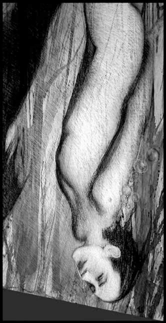 Returning to Fig. 1, a sense of instability is evoked by the upside-down positioning and trails of randomly streaked paint that signify the dive into chaotic waters. Here, estranged from everyday reality, in a prologue to critical confrontation, the dreamer, artist or celebrant of alchemical mysteries merges with darkness and suffers a figurative death-- the prerequisite for change.