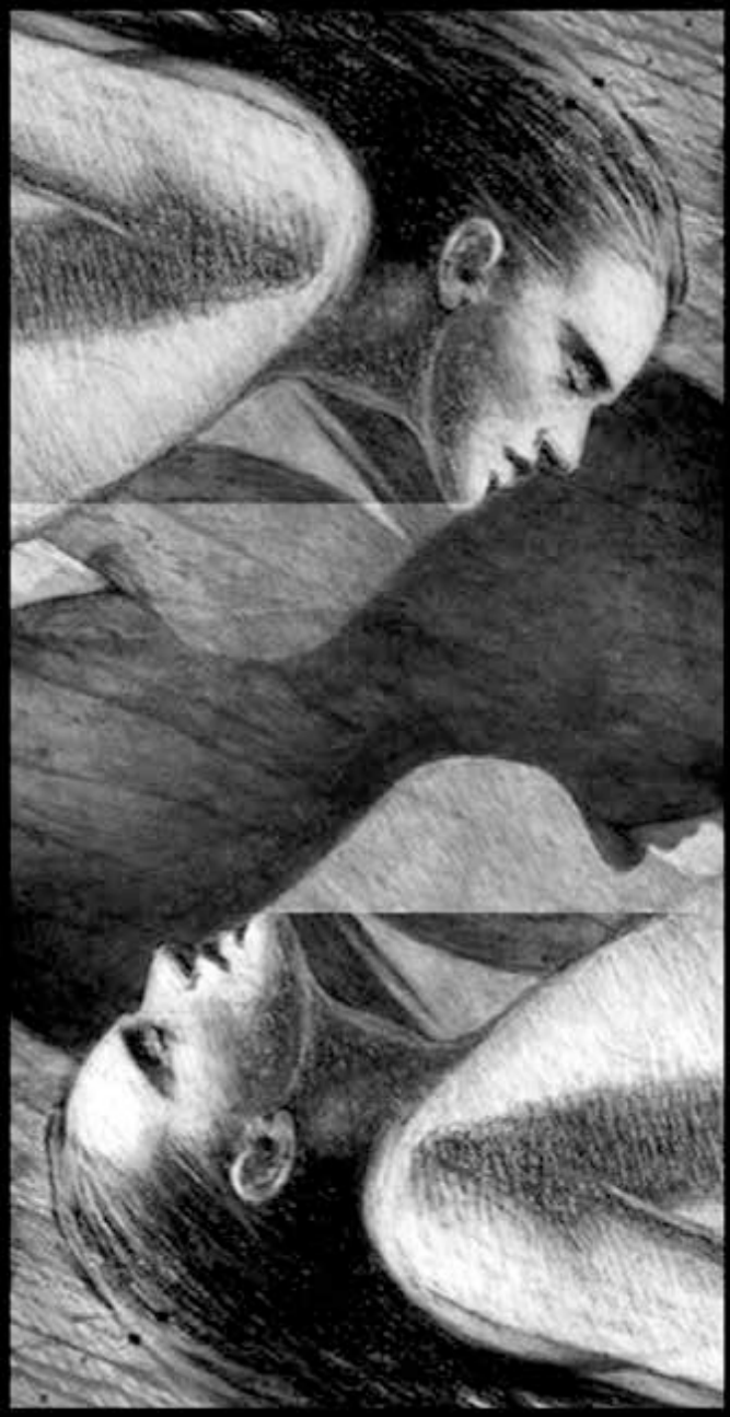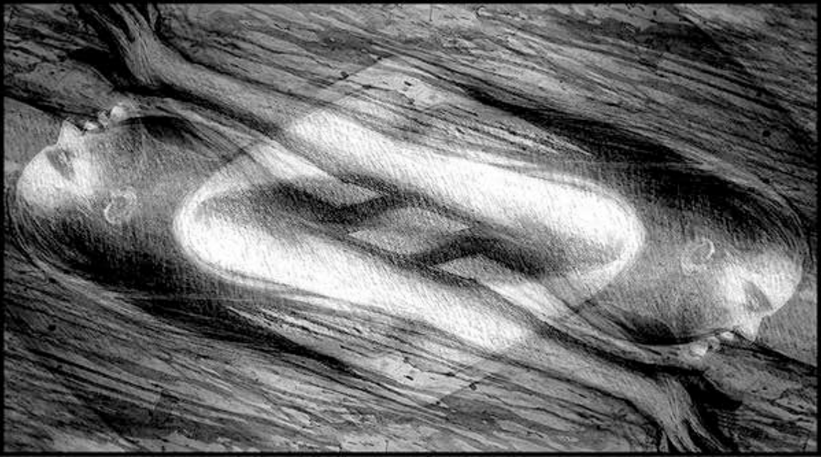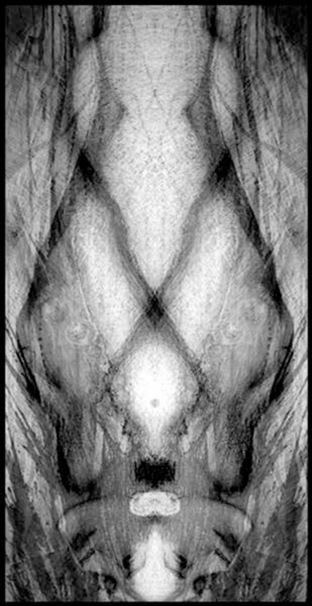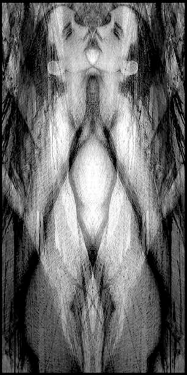 Figure 2 depicts the coincidentia oppositorum, known and unknown, self and anti-self, in primal conflict. The binary image is based on Figure 1, which itself exploits a chaotic aesthetic in the propulsive layout and an ambient pattern of paint "decided" by chance. Here, two partially transparent versions of the original are rotated and superimposed, placing the intertwined pair in a chaotic, oscillatory dimension at the intermediate, regressive phase of transcendent function. Though fraught with danger, this transitional phase space is the wellspring of creativity, wholeness and health. Indeed, the therapeutic utility of dissolution is widely acknowledged, especially among psychoanalytic practitioners and theorists influenced by the nonlinear paradigm. If integrated by the psyche, unconscious content itself constitutes a widening of consciousness that potentially transforms darkness into a source of illumination.